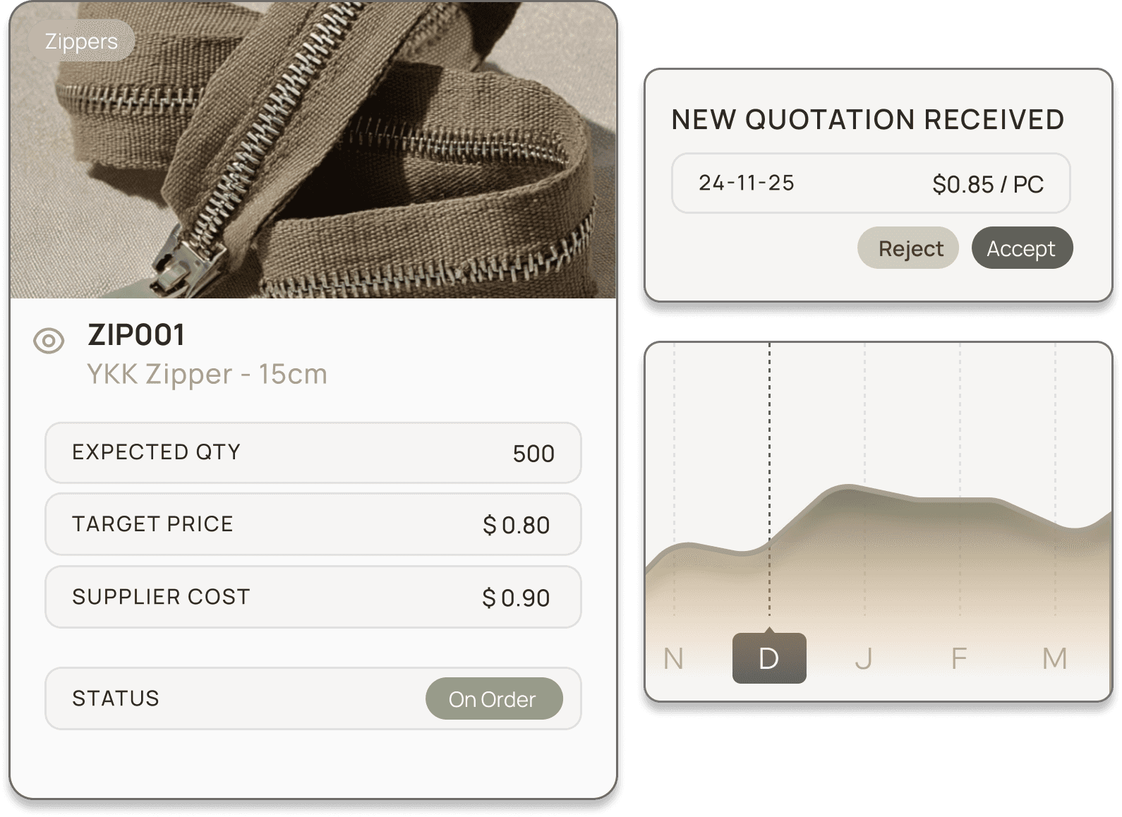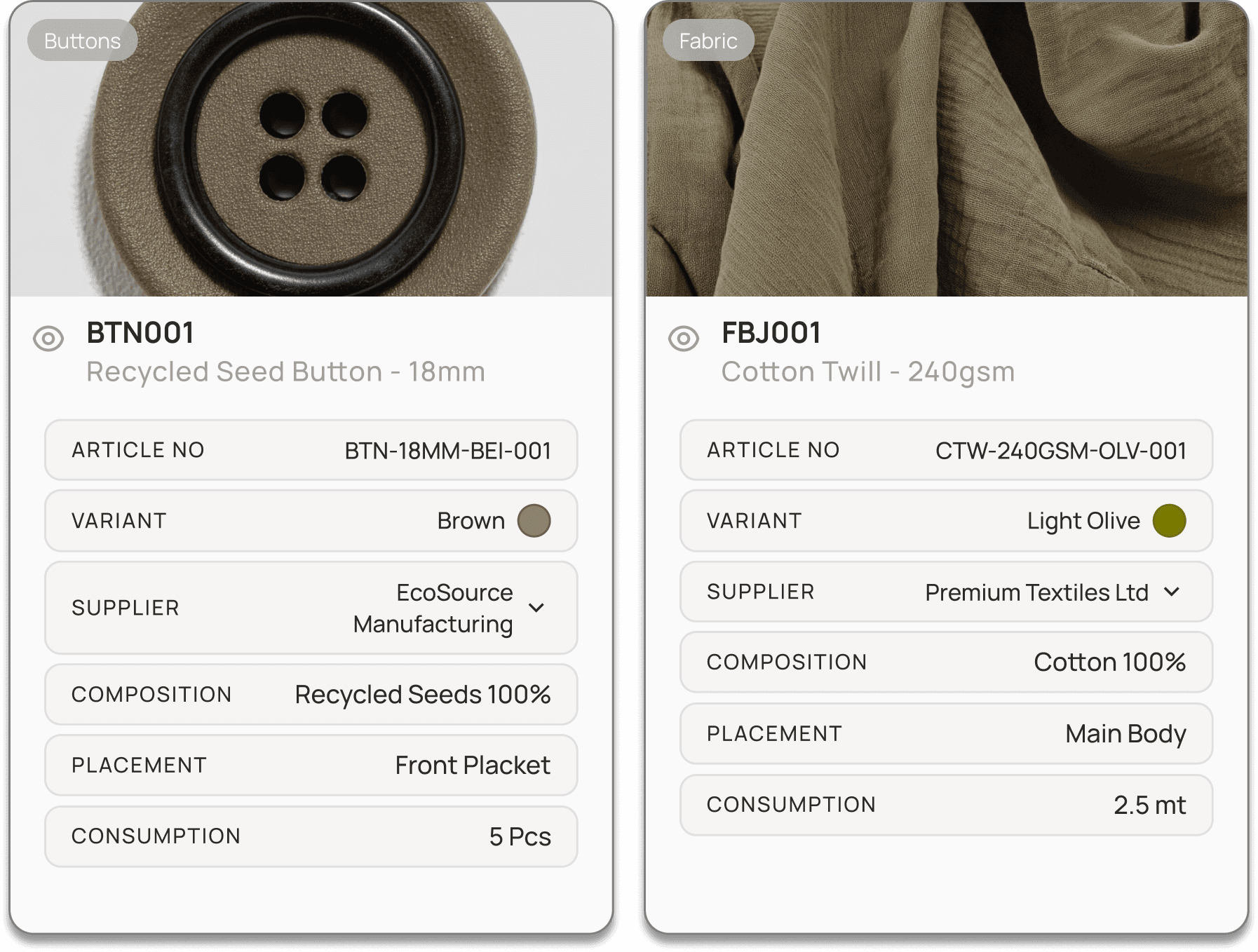 Make sure every zipper, label, and button is tracked from design to delivery. Get full visibility of your costs & consumptions in real-time.