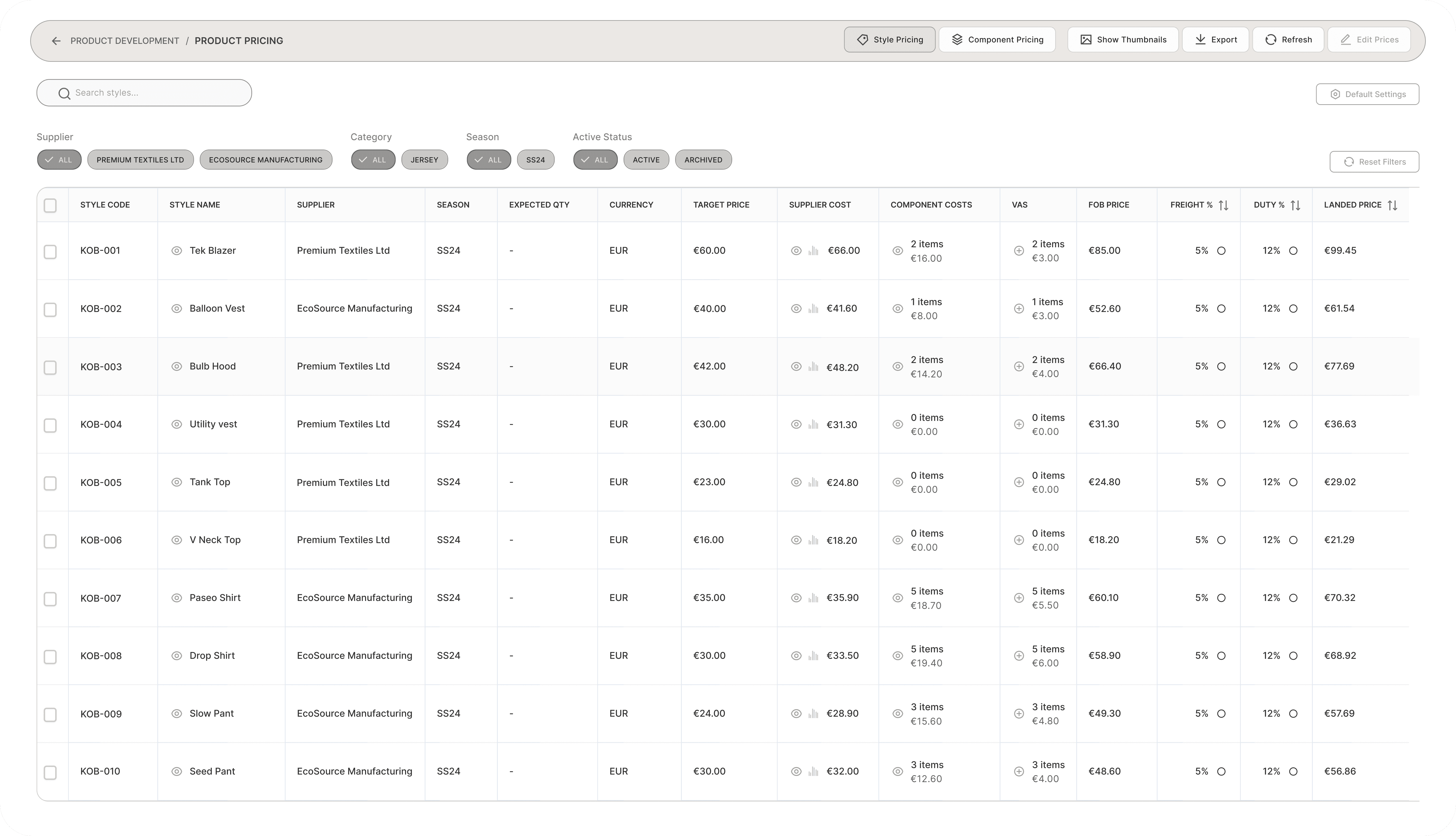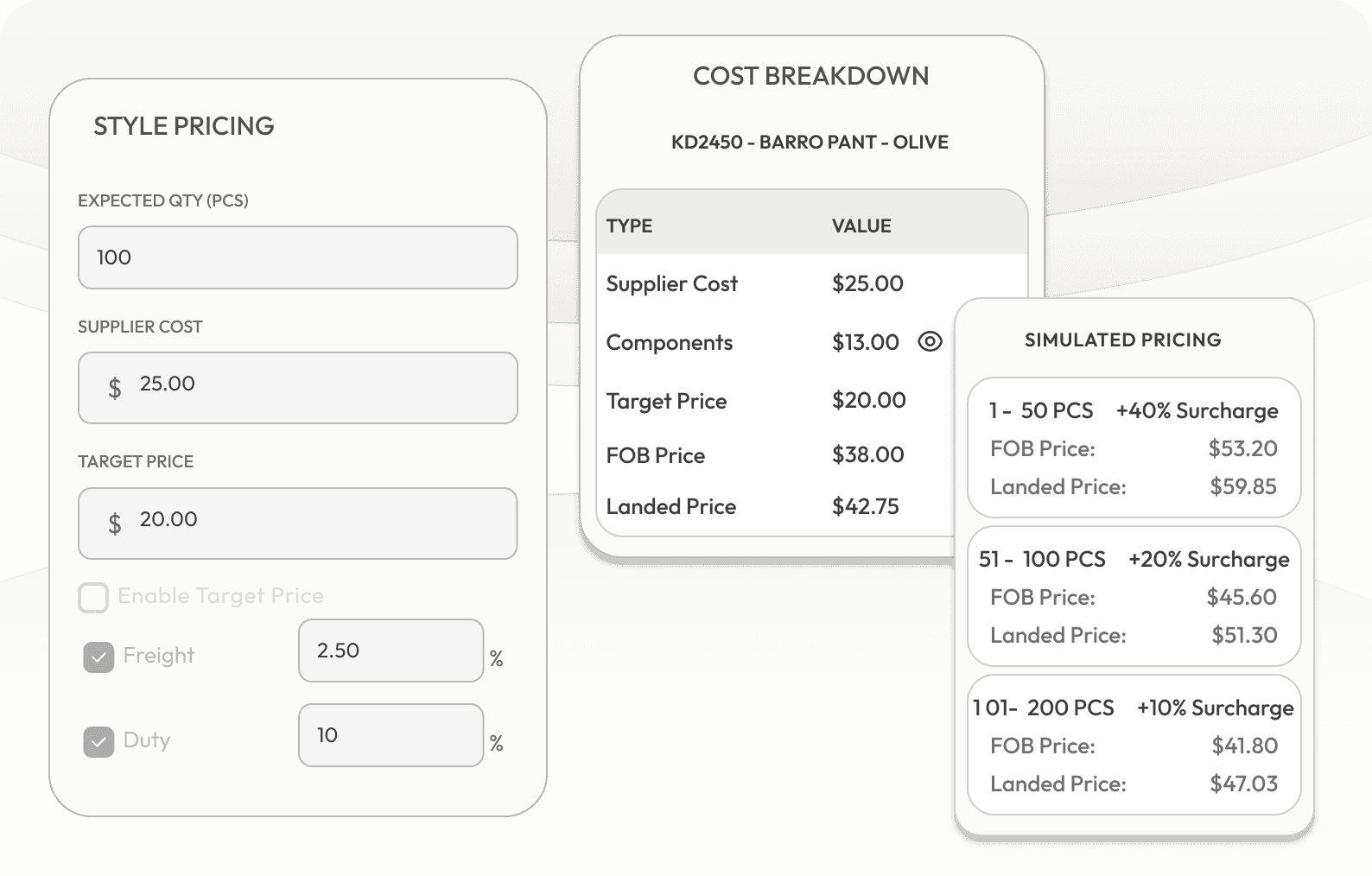 Factor in surcharges, MOQs, shipping, and fees upfront. Kobo helps you model true costs — so your pricing holds up in production.