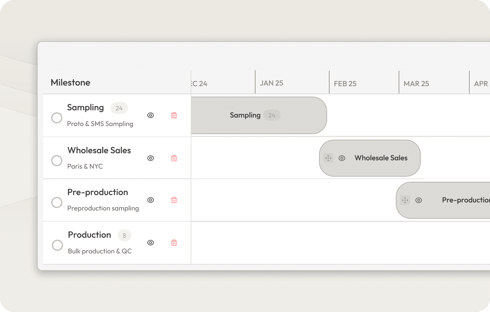 Flexibly define milestones and link tasks directly to styles, tech packs, or samples, fitting your unique workflow.